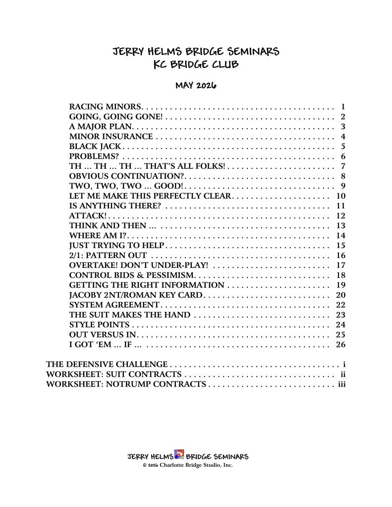 Jerry Helms is coming to Kansas City for a one day workshop on May 9, 2026, as a fundraiser for Mo-Kan Bridge Academy! He keeps telling us he is retired, but for us, he’ll help us raise money! $200 entry fee, limited space. Tickets on sale now! Jerry has also agreed to be raffled off to be someone’s partner in the noon game at the Studio on Friday May 8 and a separate raffle to join him for dinner after the game. Click here for more info and to buy raffle tickets!